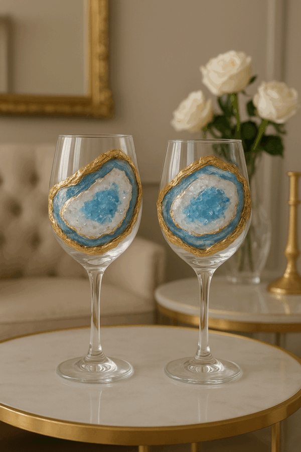 Detalle en resina con acabado dorado y Azul, sobre vidrio.