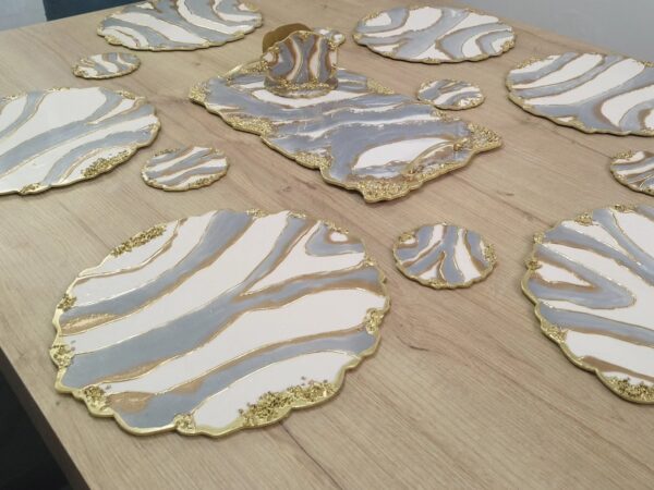 Nuestras bandejas de lujo en resina son piezas únicas, diseñadas para transformar cualquier espacio con un toque de sofisticación y arte. Cada una es elaborada cuidadosamente a mano, con detalles en cristales, cuarzos y muranos, que reflejan la luz y realzan la belleza de tu decoración.