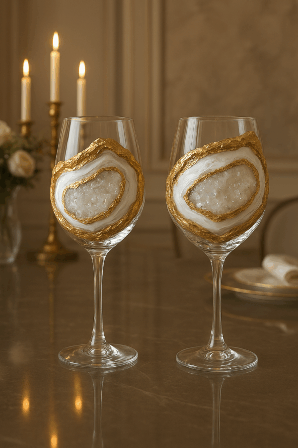 Detalle en resina con acabado dorado y blanco, sobre vidrio.