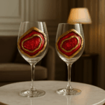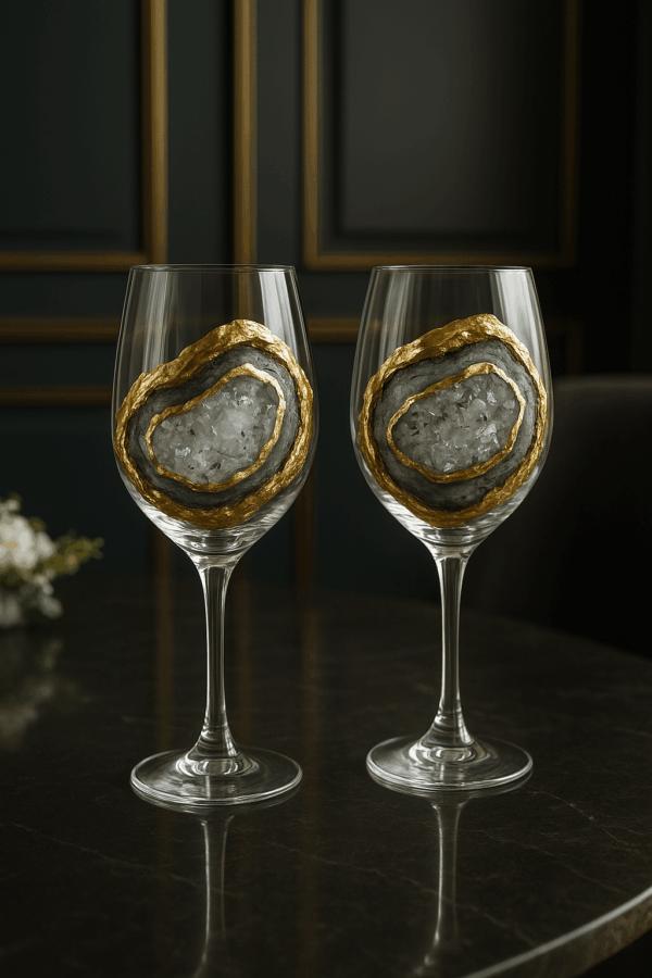 Detalle en resina con acabado dorado y gris, sobre vidrio.
