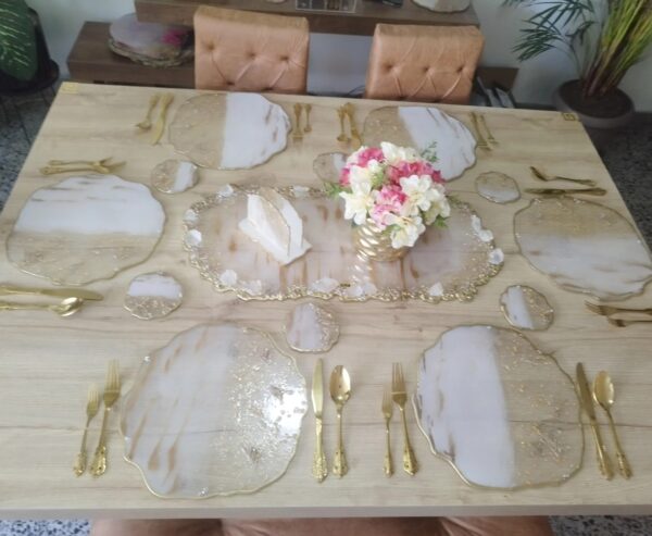 Set de mesa de lujo en forma irregular, es una opción perfecta para resaltar la belleza de tu mesa con un estilo Exclusivo y Atemporal.