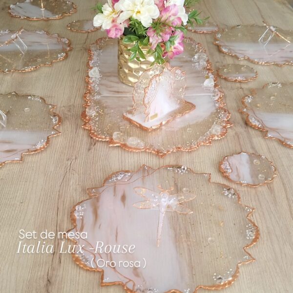 COLOR: Blanco perla con vetas palo de rosa y dorado con encapsulados de laminillas de oro rosa 24k y brillantes.