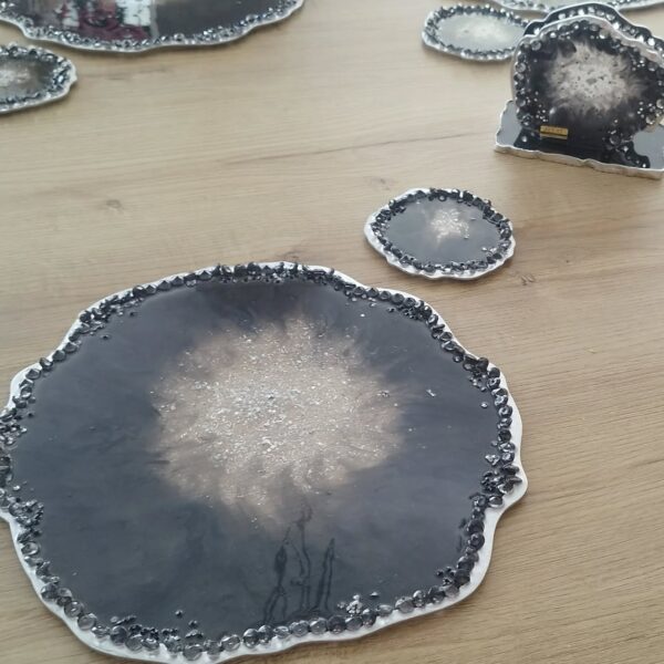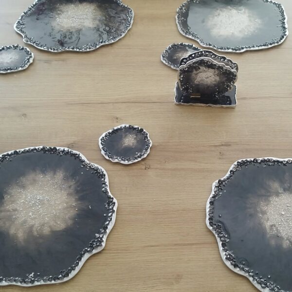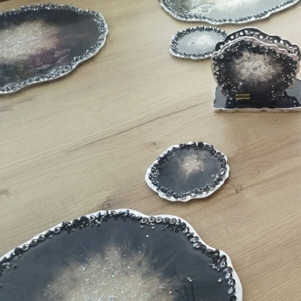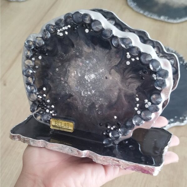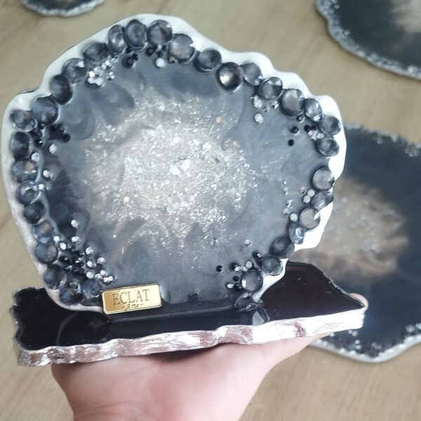 Resina con detalles de lujo, cristales, piedras, muranos y laminillas.