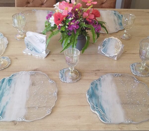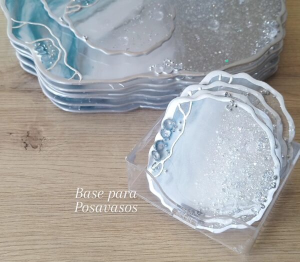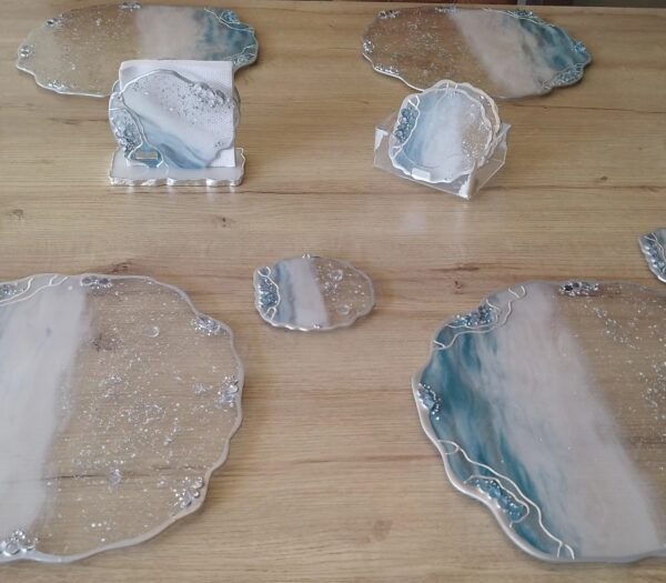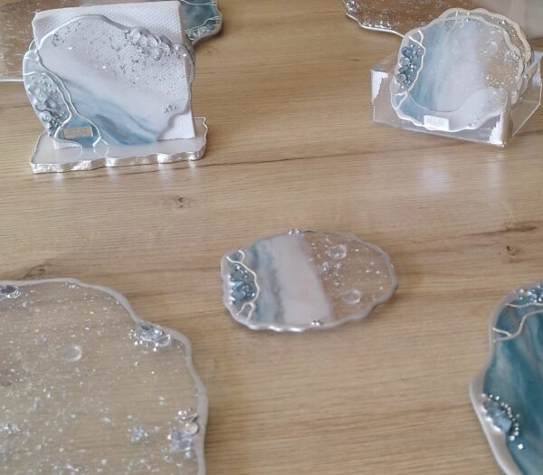 Resina con detalles de lujo, cristales, piedras, muranos y laminillas.