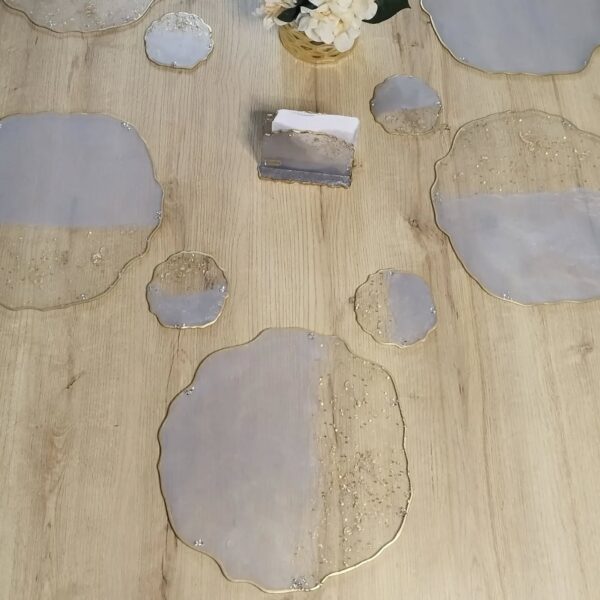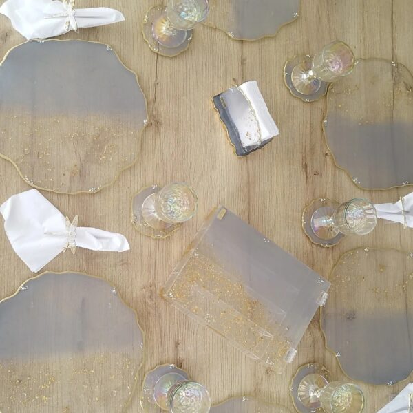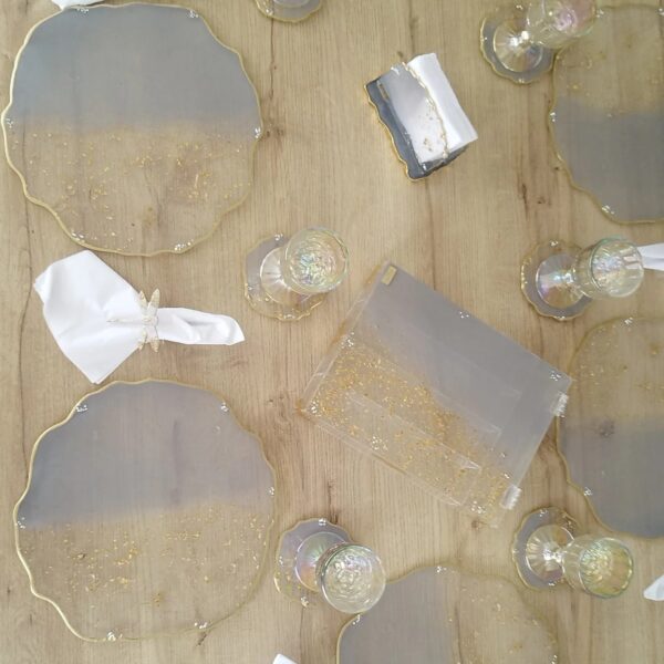 Resina con detalles de lujo, cristales, piedras, muranos y laminillas.