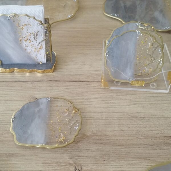 COLOR: Gris perla y plata, con transparecias en las que se visualiza encapsulados de laminillas de oro de 24k y flores naturales.